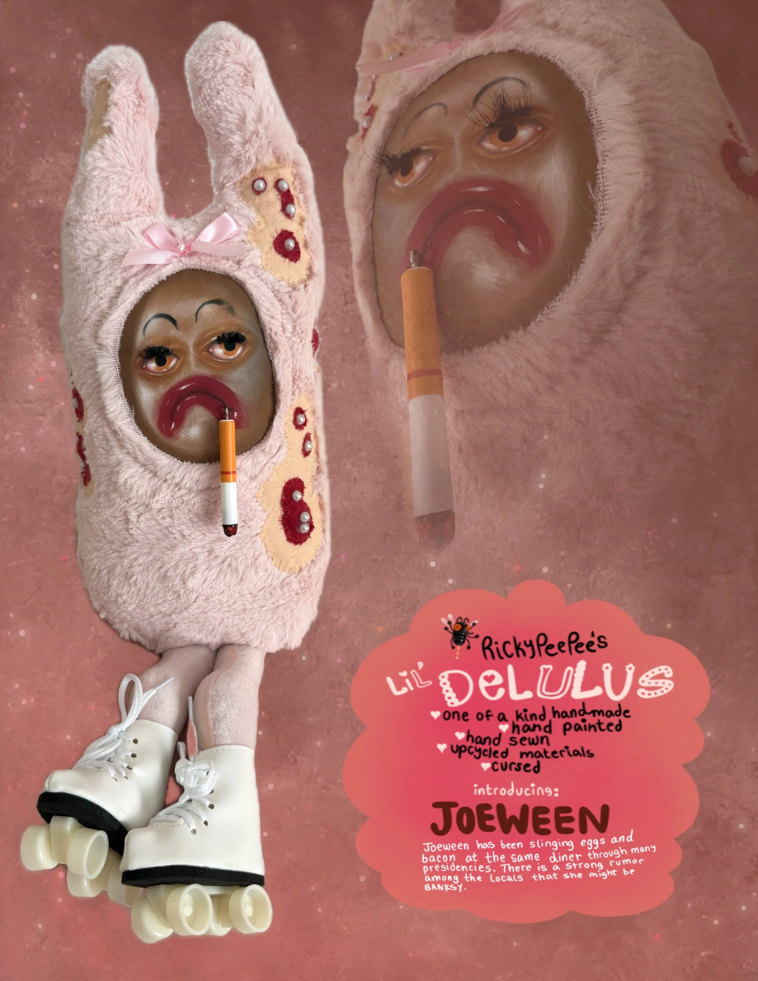 Image 1 of 1 Lil' Delulu Plush - Joween $90.00 sold out One of a kind hand-made, hand painted, hand sewn, upcycled materials, cursed. 15” Tall - Mixed Media Sold Out Added! One of a kind hand-made, hand painted, hand sewn, upcycled materials, cursed. 15” Tall - Mixed Media