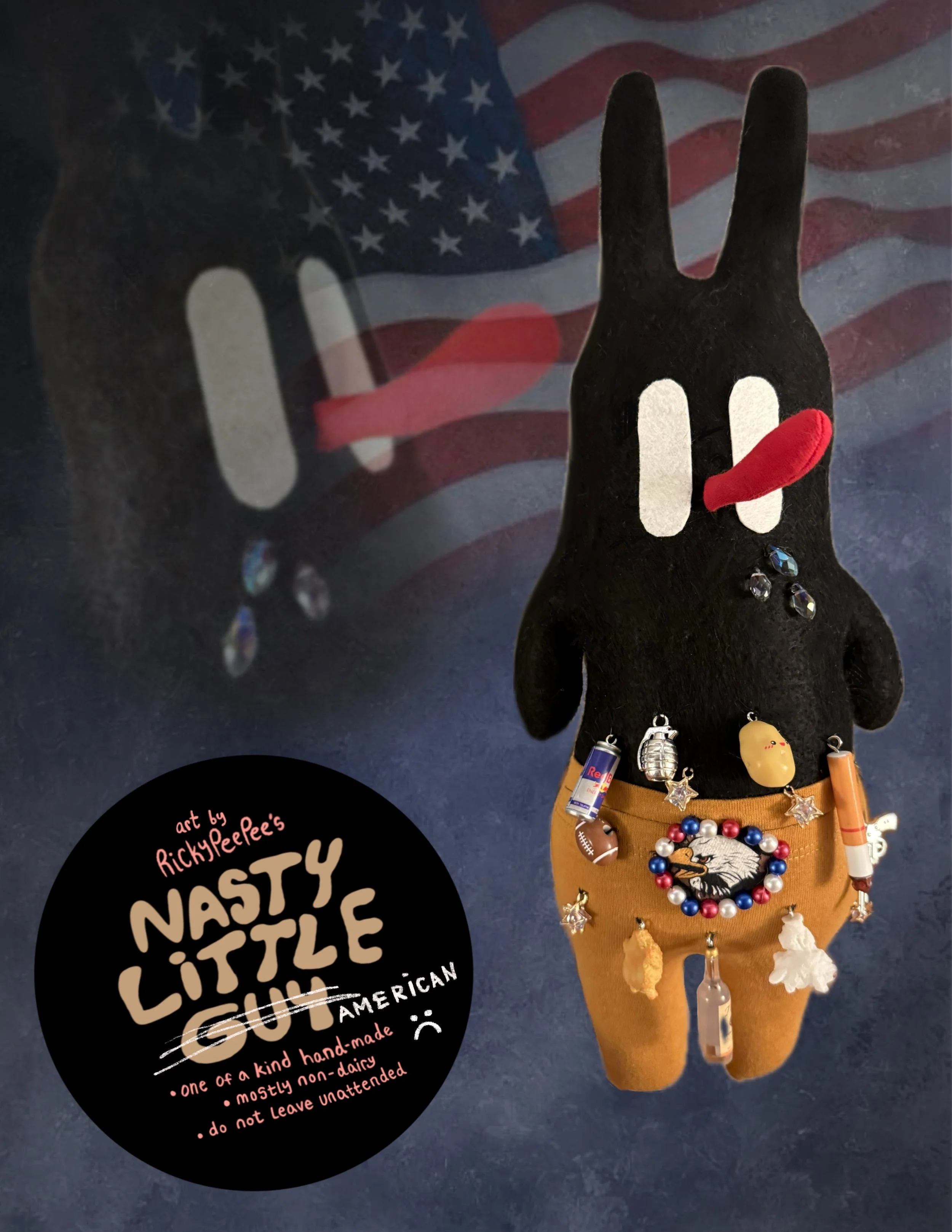 Image 1 of 1 Nasty (American) Little Guy Plush $50.00 sold out One of a kind hand-made, mostly non-dairy, do not leave unattended.10” Tall Multi Media Sold Out Added! One of a kind hand-made, mostly non-dairy, do not leave unattended.10” Tall Multi Media