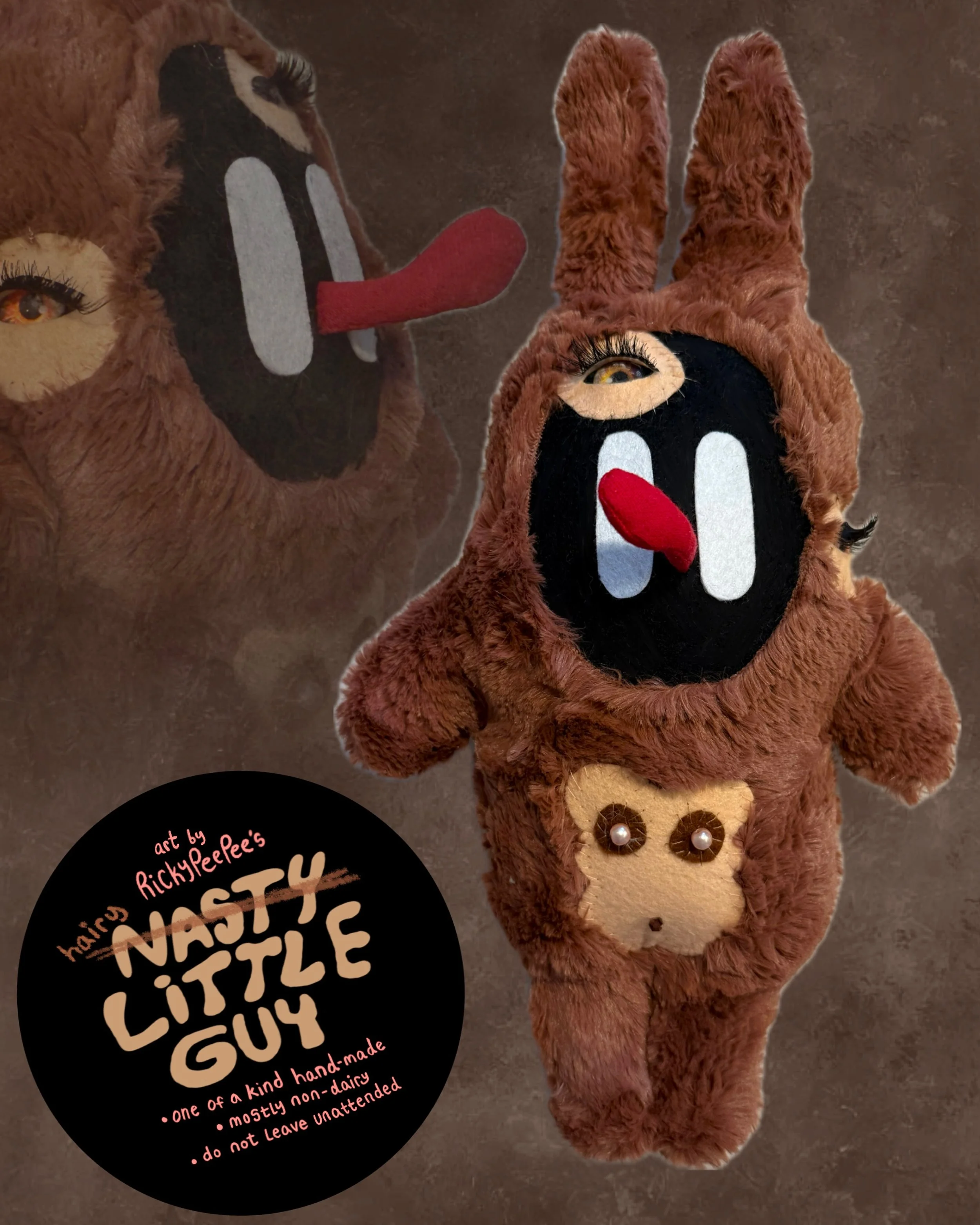 Image 1 of 1 Nasty (Hairy) Little Guy Plush $65.00 One of a kind hand-made, mostly non-dairy, do not leave unattended.10” Tall Multi Media Add To Cart Added! One of a kind hand-made, mostly non-dairy, do not leave unattended.10” Tall Multi Media